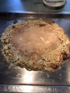 お店の人が目の前で焼いてくれ、食べ方も教えてもらいました 。お好み焼きと違って、小さなコテでおこげをくっつけながら食べる・・・