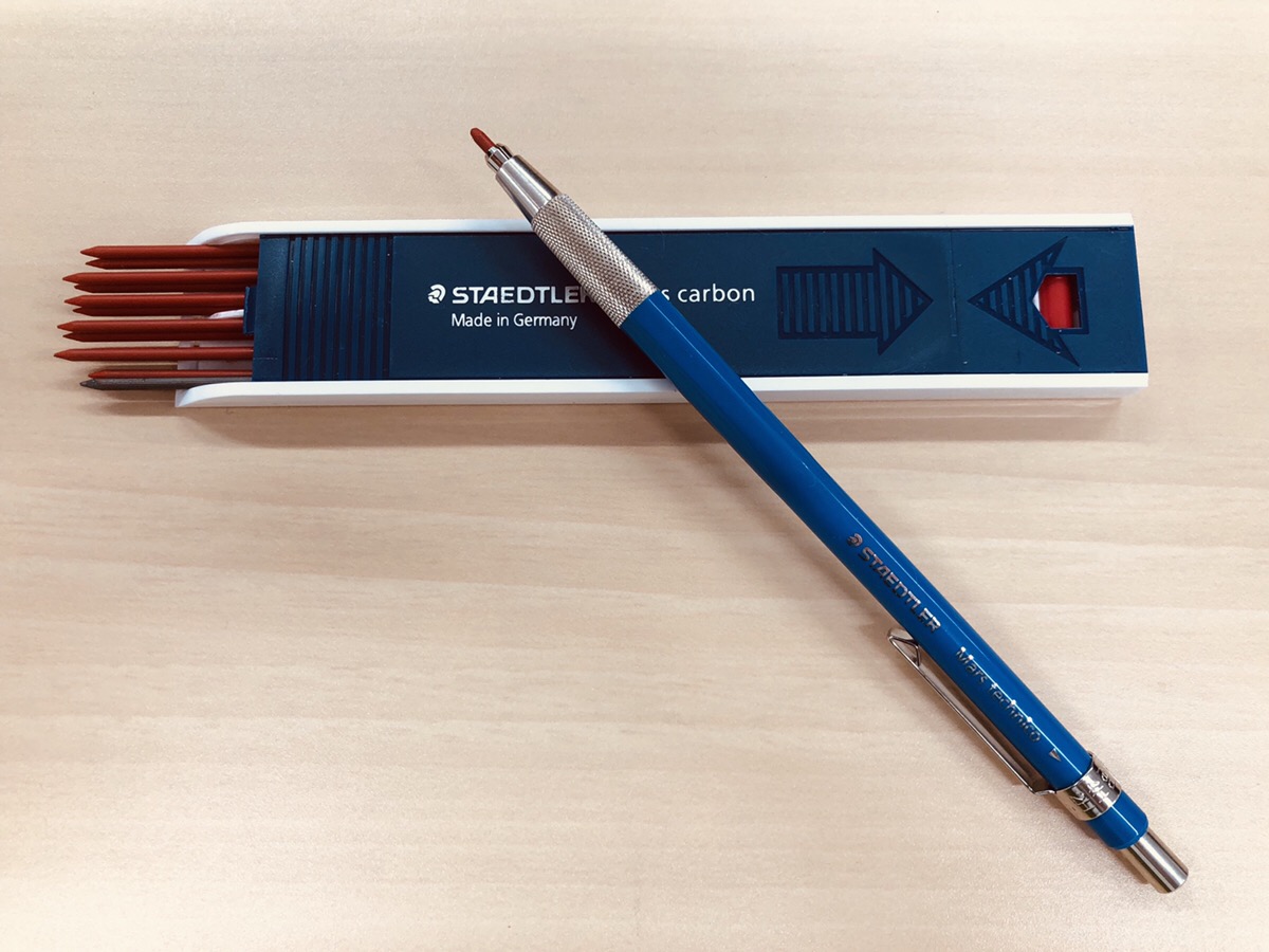 そもそも私とステッドラーとの出会いは、はるか昔10代の頃でした。当時、測量会社で製図のアルバイトをしていた私は、作業服のおじさんたちの中に紛れた、シンプルでスタイリッシュ、無駄がなく洗練された文具に一目惚れをしてしまいました。製図のアルバイトで初めて手にしたものが芯ホルダーです。シャープナーで削って使うのですが、私が渡されたホルダーはグリップの部分が黒いプラスチックのものでした。ちなみに下の合金製のものは課長クラスの人しか持っておらず、たちまち私の憧れの文具になったのです。そんなに高くはないのですが、いい大人になってからようやく手に入れました。※当時、怖いもの知らずだった私は、課長に ホルダー替えっこしてほしいと懇願しましたが、断られました(笑)