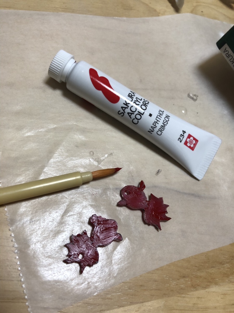 金魚らしくなるように、裏面をアクリル絵の具で赤く着色し、もう一度『レジン液』を塗って硬めます。