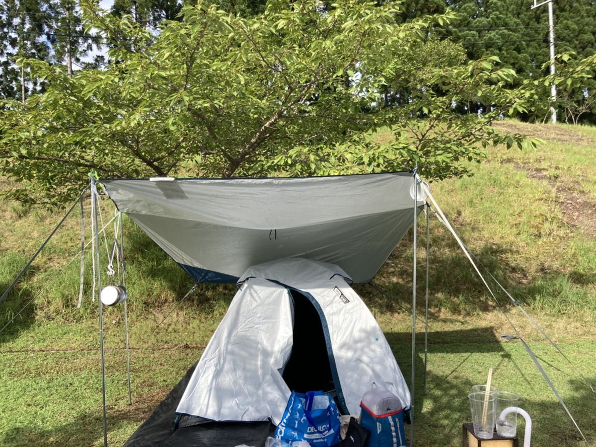 こんにちは! 生産部門 畝川です。 暑い日が続いて、マスクをするのもしんどくなってきました。 最近は巣ごもりをしたりと個人的には過ごしにくい毎日ですが、 去年から趣味として始めたキャンプを夏になったので今夏解禁しました! 去年からはグレードアップして、 タープ(屋根のようなもの)とテントを買いました。、 あとは、その他キャンプグッズも着々と買い集めているところです。 というところで初心者キャンプをしてきたので書いていきます。 今回は京都の亀岡市にあるキャンプ場に行ってきました。 ~宇津峡公園キャンプ場~友人と二人で行ってきました。 レイアウトを自分たちで考えてタープとテントを張ってみました。 キャンプで屋根の確保が必須なので、 キャンプ場に着いてからはすぐに作ります。