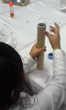 マスキングテープ、マッチ棒、ラップにゴム、などなど、材料が揃えられてあって、講師の先生の丁寧な説明に従って作業を進めていきます。