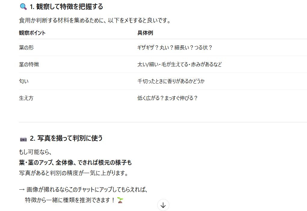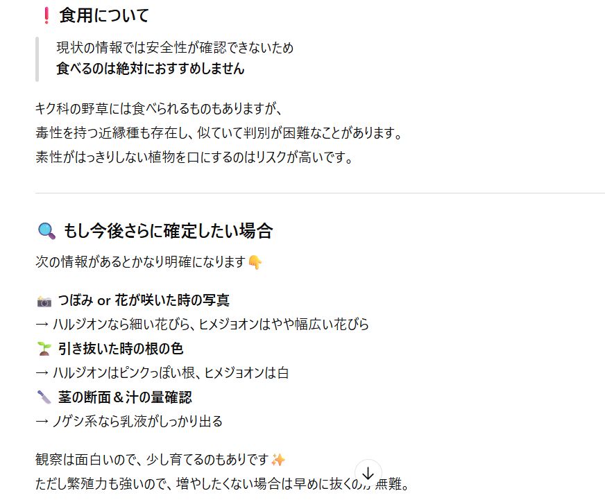 「見知らぬ植物は一見食べられそうでも、有毒なものだったり似た種だったりするので自己判断で食べるのは絶対に避けた方が安全です。」という答えだけではなく、